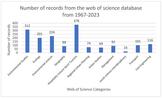 According to the Web of Science categorization, 22.62% (378) of publications were classified under Hospitality Leisure, Sport & Tourism, followed by 18.7% (312) under Environmental Studies and 13.4% (224) under Environmental Science. In the first third of the analyzed period, the focus was primarily on Environmental Science, particularly in the areas of ecology, agriculture, and anthropology. In the second third, the emphasis shifted toward Hospitality, Leisure, Sport, and Tourism, with Environmental Studies and Environmental Science following. In the final third, the focus returned to Environmental Science and Environmental Studies, with a strong emphasis on green sustainable science and technology.