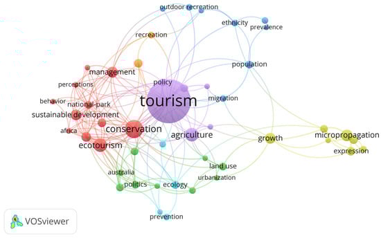 For RQ8, which aims to clarify the conceptual structure of rural tourism, we conducted a keyword co-occurrence analysis [37,38,39,40]. Through this analysis, we extracted relevant publications and successfully identified and categorized distinct thematic clusters that characterize the field.