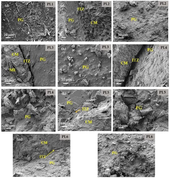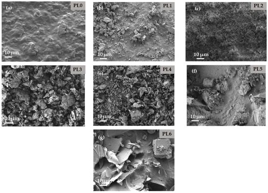 The analysis revealed that the surface of the initial untreated granules (PL0) is not absolutely smooth, showing various small inclusions (up to ~20 µm) fused onto the granules during production (Figure 1a). The surfaces of PGs (PL1) mechanically roughened by mixing with sand appeared more damaged, with small sand residues (up to ~15 µm) visible (Figure 1b). After spraying the PL2 granules with glue and mixing with microsilica powder (commonly used to accelerate cement hydration and improve physical and mechanical properties), a relatively thick layer of fine MC particle accumulations was observed covering the PG surface (Figure 1c). Covering PL3 with acryl styrene and mixing with metakaolin also produced a quite thin layer of plate-like metakaolin particles firmly adhered to the surface (Figure 1d). PL4 granules (Figure 1e) displayed numerous sharp-edged ground quartz sand particles attached to the surface, ranging from ~1 to ~30 µm in size. The surfaces of PL5 and PL6 granules (Figure 1f,g) were heated to their melting temperatures, causing the selected additives—sand (PL5) and ground glass (PL6)—to fuse into the PGs. This fusion suggests strong adhesion with the cement matrix.