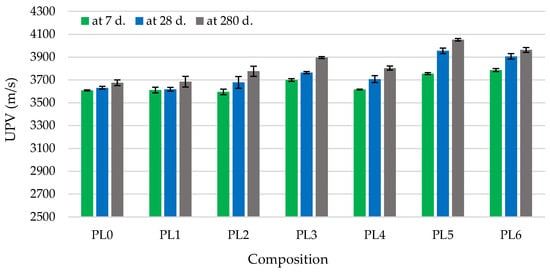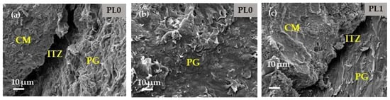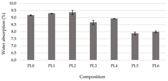 The measured water absorption values (Figure 8), which partially characterize the open porosity of the specimens, were consistent with the results of density, UPV, strength evaluation, and SEM analysis. A higher water absorption was observed in the PL0, PL1, PL2, and PL4 compositions having worse bonding and clear gaps between the PGs and the cement matrix. Additionally, in PL2, due to the more porous structure formed around the granules, water absorption was the highest. These compositions showed lower density, UPV, and strength. In contrast, the lower water absorption of the compositions PL5, PL6, and PL3 can be attributed to better physical contact between the PGs and the cement matrix, which was also confirmed by higher density and strength along with the results of the SEM analysis.