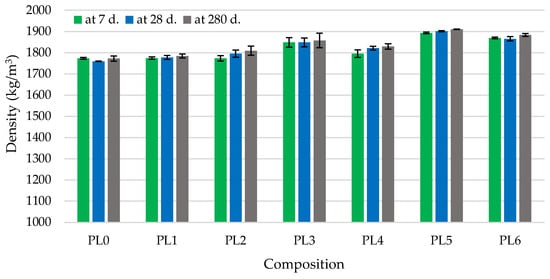 The density of the lightweight concrete (Figure 3) varied from approximately 1760 kg/m3 to 1911 kg/m3, depending on the preparation method of the PGs. The lowest density was observed in PL0 control specimens due to the weak adhesion between the PGs and the cement matrix, resulting in additional air voids between them. The surface roughening of PGs led to a slight increase in density (by up to 18 kg/m3), but this preparation method did not significantly reduce air voids at the PG–matrix interface. The highest density was achieved in PL5 specimens, where PGs were coated with standard construction sand and heated to 200 °C. At this temperature, the PG surface partially melted, incorporating sand particles into its structure, resulting in an increase in density of 8% compared to the control. Notably, these specimens exhibited no cracks or pores in the contact zone (Figure 2k).