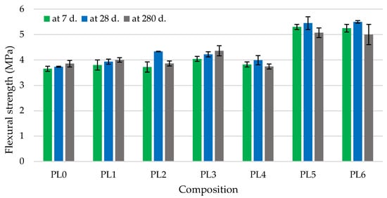 The flexural strength of the obtained lightweight fine-grained concrete (Figure 5) was highest for the PL5 and PL6 compositions, where PGs were heated to 200 °C, enhancing adhesion between the PGs and the cement matrix. Compared to the control specimen (PL0), the flexural strength increased by approximately 30–50%, depending on the curing time. This improvement can be attributed to two key factors [64]: the interlock mechanism, where angular aggregates provide better mechanical interlocking compared to round ones, resulting in higher resistance to movement and improved load transfer across cracks, and bond strength, where the rough surface of angular aggregates increases the bond with the cement paste, contributing to overall strength. On the contrary, the PL0 and PL1 compositions exhibited the weakest flexural strength due to poor adhesion between the PGs and the cement matrix, combined with the smoother surface of the PGs, which limited both the interlock and bonding mechanisms. It is seen that PL2 and PL4 have the highest flexural strength after 28 days, but then, the strength starts to decrease, and this could be related to the use of spraying glue, which influences the formation of the porous structure near the granules, and this impact is stronger over time (Figure 2e). Furthermore, according to the authors of [65], the flexural strength could decrease after a longer time due to the shrinkage of the concrete, environmental conditions, and irregular distribution of the fibers (in our work of PGs).