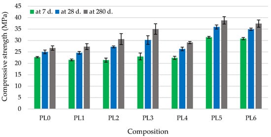 The compressive strength of the control lightweight concrete composition PL0 containing initial PGs without any additional processing was ~22.7 MPa after 7 days and showed a gradual increase with time, reaching ~25 and ~26.7 MPa after 28 and 280 hardening days, respectively (Figure 6). According to the construction regulations, such compressive strength is insufficient for use in reinforced beams, columns, and floors, but this concrete could be used in other structures where a compressive strength of no more than 20 MPa after 28 days of curing is required. The PG surface activation by mechanical roughening (PL1) alone was shown to not be enough to contribute to a strength improvement in the lightweight concrete. For PL3, the compressive strength after 7 days was comparable to the control, but after 28 days, it increased by 20%, and after 280 days, it improved by 31%, due to the pozzolanic activity of waste metakaolin. According to other studies [66,67], incorporating metakaolin into concrete mixtures significantly enhances the material’s physical and mechanical properties, including compressive strength, durability, and resistance to chemical attack. This improvement arises from metakaolin’s pozzolanic reaction with calcium hydroxide produced during cement hydration, forming additional calcium silicate hydrate (C-S-H) gel, which contributes to a denser matrix and an enhanced microstructure. PL2 and PL4, using microsilica and ground quartz, respectively, also showed an increase in compressive strength after 28 and 280 days due to their pozzolanic activity, although the effect was less pronounced compared to PL3. This may be due to the use of synthetic-rubber-based spray adhesives, which created a more porous cement matrix structure around the granules, reducing the concrete density in PL2 and PL4. In contrast, in the PL3 composition, the granules were first coated with a styrene–acrylic solution, which is known for its high durability and stability in alkaline environments typical of concrete. Styrene–acrylic polymers [68] are widely recognized for their suitability in construction applications such as in primers and adhesives, providing effective bonding under high-pH conditions. Although styrene–acrylic polymers typically offer hydrophobic properties, they did not worsen the cement matrix, while adhered metakaolin resulted in cement matrix densification and improvement around the PGs and allowed a strength of ~30 MPa to be obtained after 28 days.