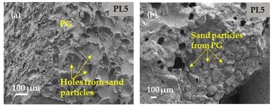 A visible enhancement in strength by approximately 40% was observed in the PL5 and PL6 compositions, which reached a strength over 30 MPa after only 7 days and ~35 MPa after 28 days, indicating the effectiveness of the applied PG preparation procedure, where heating allowed for the firm incorporation of the sand or glass particles into the PG surface, while the presence of particles at the surface formed developed surface topography, thus increasing the contact area between the PGs and the cement matrix and improving the interlocking effect. Moreover, both glass and sand possess good wettability with a water solution containing dissolved cement minerals, thus contributing to the formation of closer contact at the interface. SEM analysis (Figure 7) revealed that while the bond between the coating materials and the cement matrix is stronger than that with the PGs themselves, this strong adhesion significantly reduced gaps around the PGs. Furthermore, the higher strength of the sand particles themselves compared to the glass particles contributed to the slightly higher strength values of lightweight concrete PL5 (with sand-covered PGs) compared to PL6 (with glass-waste-covered PGs).