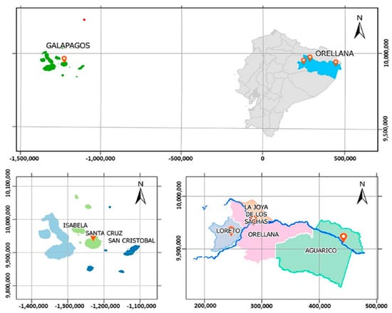 This study was carried out in three open-air waste dumps belonging to the Amazon region, the Orellana province, the Francisco de Orellana canton, Loreto, and Aguarico and a sanitary landfill belonging to the Insular Region, the Galapagos province, the Santa Cruz canton. There, each of these final disposal sites were overseen by the Decentralized Autonomous Municipal Governments (GADMs), which were for Loreto (MALC), Francisco de Orellana (MAFO), Aguarico (MAA) and Santa Cruz (MASC) (Figure 1).