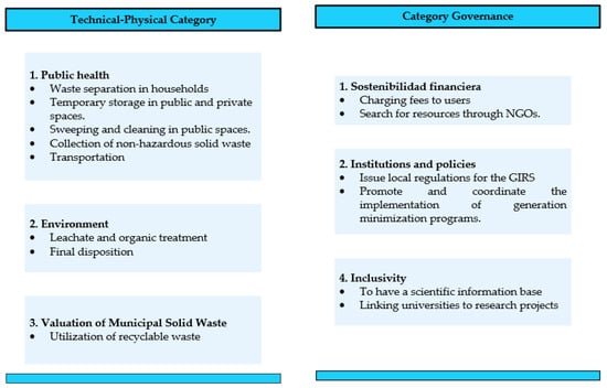 Descriptive research was carried out to assess the public service of the integrated management of the non-hazardous solid waste (MSW) of the Amazon and Insular Regions. This study included interviews with citizens and technicians of the GADM, field visits to the final disposal sites, and a review of the documentation of the means used to verify compliance with the provisions established by current environmental regulations, as well as compliance with indicators set forth in national and international technical standards. Solid waste management is a complicated reality that cannot only be sustained with investments and equipment but depends on authorities in socially associated governance issues [40,41,42,43]. Consequently, as shown in Figure 2, six aspects divided into two MSW categories were evaluated.