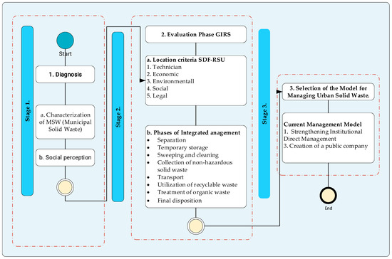 The evaluation was performed in three stages. Stage 1: the development of a conceptual framework based on the technical, environmental, economic, social, and legal aspects that were measured through compliance indicators given in the legal framework, as well as using national and international technical standards. Stage 2: The identification of findings in Conformity (C), Minor Non-Conformity (NC-), and Major Non-Conformity (CN+). Hence, in order to quantitatively assess the degree of compliance, a weighting was applied based on the importance of each aspect and indicator, the level of confidence, and the risk in terms of provisions established in currently enacted regulations. The compliance level was identified through the traffic light system (green, orange, and red). Stage 3: the design of the MSW management model. Finally, Figure 3 outlines the methodology of the research produced for the evaluation [44].