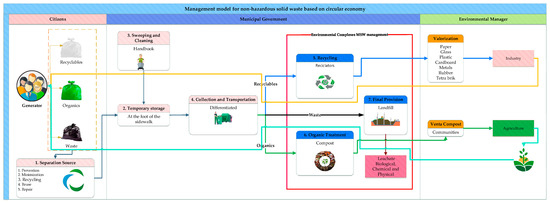However, the management model took into account a variety of factors. First, the user, also referred to as the generator, was in charge of the waste hierarchy, which included the (a) prevention of and (b) reduction in generation at the source by remanufacturing, re-proposing, eco-design, reuse, repair, restoration, and servitization. Second, the municipal administration was in charge of the cleaning and sweeping stages, as well as the separate collection of MSW, recycling, organic waste treatment, and landfill disposal. Third, the Environmental Manager would receive the recycled material to be used as a raw material for new goods.