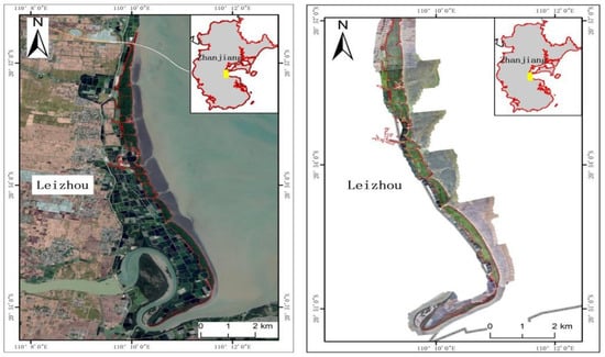The Leizhou Peninsula, located in the southernmost part of mainland China, is bordered by the South China Sea to the east, the Qiongzhou Strait to the south, and the Beibu Gulf to the west. The terrain is relatively gentle, rising in the northwest and sloping toward the southeast, with a maximum elevation of 1000 m. The region experiences a tropical oceanic monsoon climate characterized by distinct dry and wet seasons. Coastal areas are frequently affected by typhoons during the summer and fall. The east coast of the peninsula experiences irregular semidiurnal tides, while regular tides are observed along the west coast. Most mangrove forests on the Leizhou Peninsula are situated on the leeward sides of estuaries, bays, and islands. The region predominantly features sandy beaches, with sandy mudflats limited to estuaries and bays [37]. The mangroves on the Leizhou Peninsula are predominantly composed of artificially planted Sonneratia apetala communities, which exhibit the fastest growth rates. The artificial cultivation of Sonneratia apetala on the Leizhou Peninsula began in the late 1980s. By the early 1990s, the scale of cultivation gradually expanded. The planting of Sonneratia apetala on the Leizhou Peninsula is still ongoing to this day. Due to their relatively typical growth patterns, this region serves as an ideal study area for investigating the growth and evolution of Sonneratia apetala. The extent of the mangrove forests was determined using drone data from 2022 and field surveys (Figure 1).