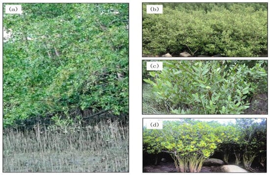 Images of Sonneratia apetala (left) and local mangroves (right) ((a) Sonneratia apetala; (b) Avicennia marina; (c) Kandelia obovata; (d) Aegiceras corniculatum).