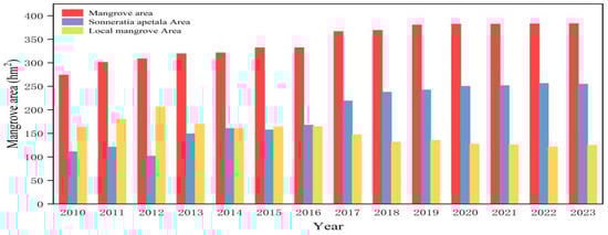 The most notable increase in mangrove forest area occurred from 2010 to 2011, with a one-year growth of 26.85 hm2. From 2010 to 2016, the growth rate was particularly significant, resulting in an increase of 58.06 hm2. Although the growth of mangrove forests slowed from 2017 to 2023, the trend remained upward, with mangroves expanding to cover more than half of the study area. Thus, we conclude that the Leizhou mangrove forests have shown a substantial growth trend over the past two decades. This ongoing trend highlights successful restoration efforts driven by increased awareness of conservation and enhanced protection measures implemented by the government [42]. The area occupied by Sonneratia apetala has also expanded significantly between 2010 and 2023. This growth is primarily attributed to both its natural spread and large-scale artificial cultivation. The species was widely planted during the 1990s and 2000s, and by 2010, it had become well established in the region. In the years that followed, its spread continued to be driven by natural processes. Additionally, localized planting and restoration efforts have been ongoing in the study area between 2010 and 2023. As a result, much of the increase in Sonneratia apetala cover during this period can be attributed to its natural expansion, as well as continued human intervention, surpassing the coverage of native mangrove species.