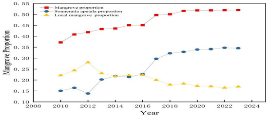Figure 6 shows the proportion of mangrove forests in the study area from 2010 to 2023. The proportion showed an increasing trend from 37.18% in 2010 to 51.99% in 2023. The proportion of Sonneratia apetala also showed an increasing trend annually. It was 15.07% in 2010 and 34.55% in 2023. In contrast, the proportion of local mangroves decreased from 22.11% in 2010 to 16.96% in 2023.
