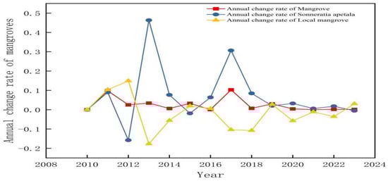 Figure 7 shows the average annual rate of change of mangrove forests from 2010 to 2023. The average annual rate of change of Sonneratia apetala fluctuated in the range of −0.1–0.1, indicating that this species increased steadily in the last 14 years. In contrast, the fluctuations in the mean annual change of the local mangroves were minimal, indicating that the influence of Sonneratia apetala caused instabilities in the local mangroves, especially during the rapid spread of Sonneratia apetala from 2016 to 2017, resulting in a large decline in the mean annual change in 2017.