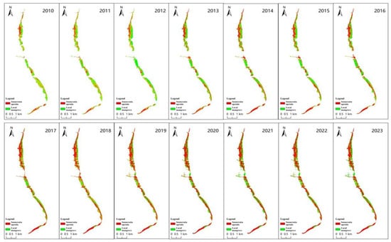 The area of Sonneratia apetala patches increased from 111.15 hm2 in 2010 to 228.38 hm2 in 2023, marking an increase of 117.23 hm2. The sharp increase in patch area in 2014 was primarily due to the rapid growth of Sonneratia apetala near the coastline (Figure 14). In contrast, the number of patches of local species increased, but their area decreased from 182.07 hm2 in 2010 to 152.49 hm2 in 2023. The patch area of local mangroves exhibited unstable fluctuations.
