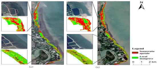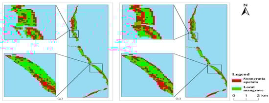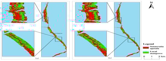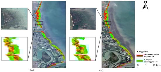 In 2010, mangrove forests along the east coast of the Leizhou Peninsula were primarily composed of naturally occurring local mangrove species and were distributed in strips. In the northern part of the study area, the mangrove vegetation was roughly split between local species and Sonneratia apetala, while in the central and southern regions, local mangrove species dominated. However, with the gradual expansion of Sonneratia apetala, the distribution of native mangrove species has been steadily shrinking. This decline was especially pronounced between 2017 and 2023, when native species almost completely disappeared from the northern part of the study area, and large populations of Sonneratia apetala increasingly replaced native mangroves in the central and southern parts.