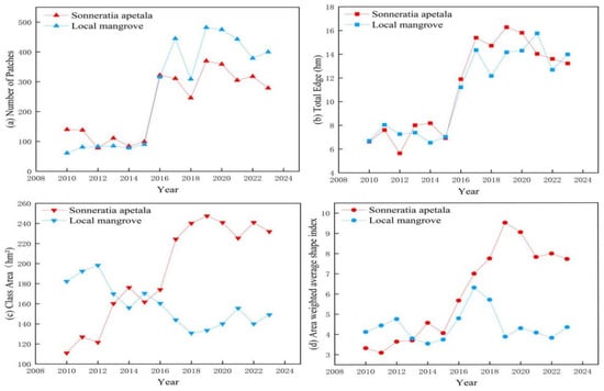 The area-weighted mean shape index of Sonneratia apetala increased significantly from 3.4 in 2010 to 7.81 in 2023, indicating notable changes in patch shape. In contrast, the area-weighted mean shape index of local mangroves remained relatively stable, increasing slightly from 4.13 in 2010 to 4.41 by 2023. Between 2010 and 2015, the shape index of Sonneratia apetala showed minimal change, suggesting that the patches maintained relatively simple shapes. However, as Sonneratia apetala rapidly spread and grew, patch shapes became more complex, leading to a significant increase in the shape index after 2015. From 2019 to 2023, the shape index of Sonneratia apetala displayed a decreasing trend, indicating that the patches became more concentrated and less fragmented.