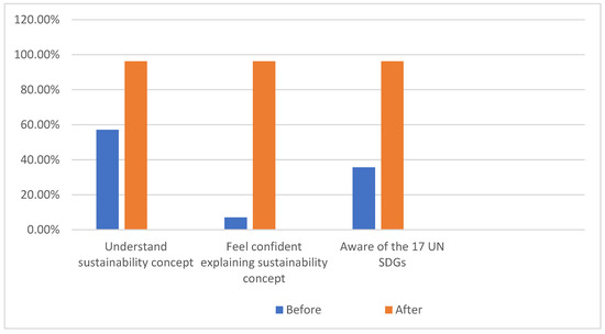 Before the course started, 57.1% of students indicated that they understood the concept of sustainability, but only 7.1% felt confident enough to explain it, and just 35.7% were aware of the 17 SDGs. After the course ended, 96.2% reported that they understood the concept of sustainability, felt confident in explaining it, and were aware of the SDGs (Figure 1).