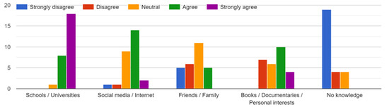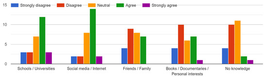 The number of students who identified schools or universities as their primary source of sustainability knowledge increased from 15 to 26, post course delivery (Figure 2 and Figure 3). Additionally, the number of students who recognized books, documentaries, or personal interests as sources of their sustainability knowledge rose from 8 to 14. Notably, no students reported having no knowledge of sustainability after completing the course.