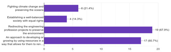 Additionally, Table 2 shows that the number of engineering students who believed that knowledge of SD enhances their employability also rose after the course. However, the percentage of students who felt that the engineering profession in Lebanon encourages its engineers to apply SD practices decreased. This indicates that after gaining a deeper understanding of the broad concept of sustainability, engineering students became more aware of their vital role in achieving it and recognized that working on sustainability could enhance their job prospects. The latter is in support of the findings of Barrella and Watson, who showed that the horizontally integrated curriculum enhanced the engineering students’ profound knowledge of SD [16]. At the same time, they also realized that their country does not support or encourage the application of sustainable practices.