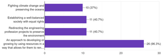 Before the course, most students associated sustainability primarily with environmental preservation (Figure 4). However, after course delivery, 96.3% considered sustainability to be an approach to developing or growing by using resources in a way that allows for them to renew or continue to exist for others (Figure 5). They agreed that, in addition to its general definition, sustainability also involves creating a well-balanced society with equal rights. Only 14.3% of the students had chosen this perspective before the course, but this number increased to 40.7% after the course ended.