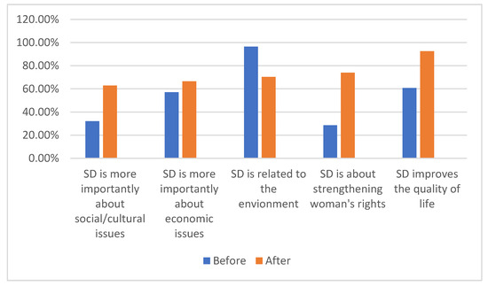 It is evident that, before the course, the engineering students did not recognize the connection between sustainability and social issues, perceiving it to be solely an environmental matter, as indicated in Figure 4, Figure 6 and Figure 8, and in line with Nakad and Kovesi and Nakad et al. [9,10]. After completing the course, the students understood that sustainability also involves creating a well-balanced society with equal rights (Figure 5). The students agreed that SD projects should encompass environmental, economic, and social issues (Figure 7) and improve overall quality of life (Figure 8). This proves without any doubt that introducing such a focused course on SD made learning more meaningful, complementing the findings of Molina-Salís et al. [19].