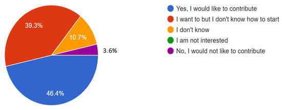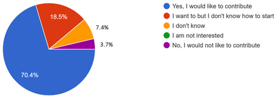 The number of engineering students who would like to contribute to making their university a more sustainable place slightly improved from 85.7% to 88.9% after course delivery, which provided ample examples on specific research centers, e.g., life cycle assessment (LCA) and geographical information systems (GISs), and EU-funded projects that are geared towards sustainability (Figure 9 and Figure 10). The number of students who would like to contribute but do not know how to start has decreased from 39.3% to 18.5%, indicating a positive increase in students’ knowledge of sustainability.