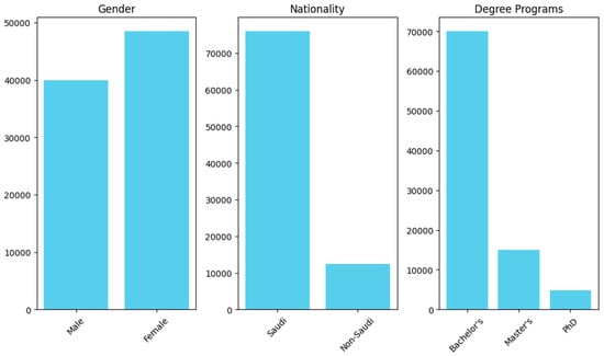 The whole pipeline of the proposed methodology is illustrated in detail, where every subsequent step from data gathering and preprocessing to model training, evaluation, and deployment is represented in Figure 1. The demographic data in Figure 2 have been summarized according to key trends in gender, nationality, and degree program distributions. The bar chart highlights the proportions of male and female students, the distribution between Saudi and non-Saudi nationals, and the prevalence of students across bachelor’s, master’s, and PhD programs. This streamlined visualization ensures clarity and readability, enabling readers to quickly grasp the primary demographic insights without being overwhelmed by excessive graphs.