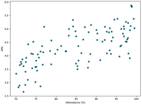 A scatterplot showing the positive correlation between attendance rates and GPA among students highlights how attendance impacts academic performance.