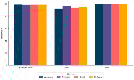 The superior accuracy and low loss values demonstrate the CNN’s ability to capture intricate patterns and complex relationships within the dataset. However, these advantages come with increased computational demands and longer training times. The CNN’s performance makes it ideal for real-time applications requiring high precision, although its “black box” nature and resource-intensive operation may limit practical deployment in resource-constrained environments. However, Figure 5 illustrates the comparative performance of the Random Forest, KNN, and CNN models. Random Forest and the CNN exhibit superior accuracy, precision, recall, and F1 scores, with the CNN achieving the highest overall accuracy of 99.97%. These results highlight the efficacy of CNNs in handling complex datasets, while Random Forest provides a balanced and interpretable alternative.