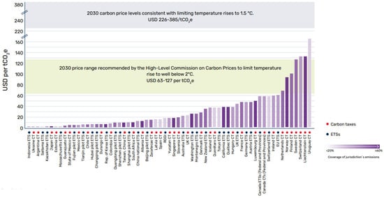 As can be seen, the median carbon price in the carbon compliance schemes presented in Figure 1 is about USD 20 per tonne of CO2-eq., which, according to the current estimates [26], is at least ¾ short of stimulating the achievement of curbs on the temperature rise assumed under the Paris agreement [26,27,28]. It is also less than the estimates of internal carbon prices reported in the academic literature [29,30] for corporations and used by them for capital budgeting and in the costing of climate projects (an average of USD 37 in 2017 [29]). Interestingly enough, earlier research by Nordhaus (2014) [31] estimated the social cost of carbon at just about USD 20 per tonne. However, even this state of carbon pricing has succeeded in generating global revenues from carbon that, for the first time, have breached through the USD 100 billion threshold in 2023—among the carbon schemes tracked by the World Bank [22].