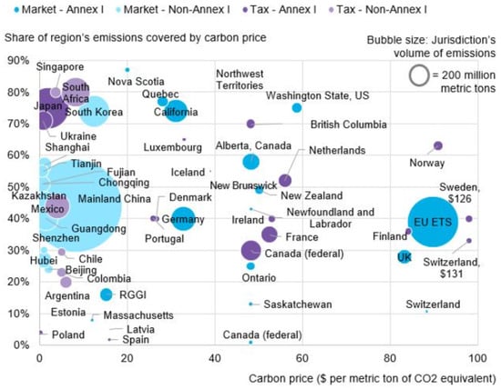 To put national-level carbon prices and pricing in an institutional and global context, as well as to adduce comparative pricing arguments, we should note that carbon pricing is implemented in the form of either carbon tax or emission-trading (ETS) systems, or both. The World Bank [22,23] and Bloomberg [24], based on emission-weighted methodologies of carbon pricing [25], post the following reviews of different carbon pricing mechanisms across the world in terms of observed carbon prices (see Figure 1 and Figure 2).