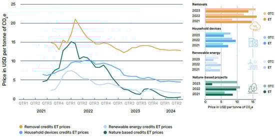 Trends in global prices for exchange-traded carbon credits generated by different types of climate projects. Source: World Bank (2024) [22].
