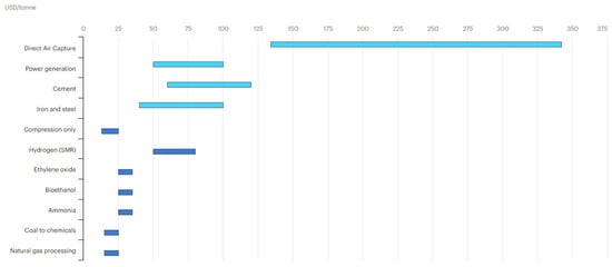 This view is borne out by the analysis from other sources. IEA (2021) [48] estimates that the costs of carbon dioxide capture systems (CCUS) can vary widely depending on the source of CO2: from USD 15–25/tCO2 for industrial processes producing “clean” or highly concentrated CO2 streams (such as ethanol production or natural gas processing) to USD 40–120/tCO2 for processes with “dilute” gas streams such as cement production and power generation (see Figure 6).