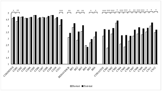 Average scores for each dimension/item before and after the course. (* p < 0.05; ** p < 0.01; *** p < 0.001).