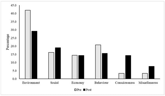A pre- and post-test questionnaire was developed and used to collect information before and after the course, respectively. The first part of the questionnaire included sociodemographic questions (age, gender, and previous studies). Additionally, participants were asked to describe their understanding of the concept of sustainability using five words. This open-ended task was chosen to obtain participants’ intuitive and core perceptions of sustainability. The brevity of the task encouraged reflection on essential aspects of sustainability and helped capture shifts in their understanding before and after the course. Responses were later categorized into five themes, as follows: environment, social, economy, behavior, and consciousness, based on standard approaches in the ESD literature [53,54]. The environment category focuses on natural systems, biodiversity, and ecological balance. The social category reflects the human and societal aspects of sustainability, including social justice, welfare, and community dynamics. Economy includes concepts related to resources, development, and economic practices for understanding the economic impacts and dependencies in sustainable practices. Behavior focuses on actions and habits that promote or detract from sustainability; this category is essential for linking knowledge and consciousness to practical application. Consciousness is critical as it relates to the awareness, attitudes, and values that drive sustainable thinking and behaviors, bridging the gap between knowledge and action. Finally, miscellaneous serves as a catch-all for terms that do not neatly fit into the other categories but are relevant to discussions of sustainability, allowing flexibility in categorization.