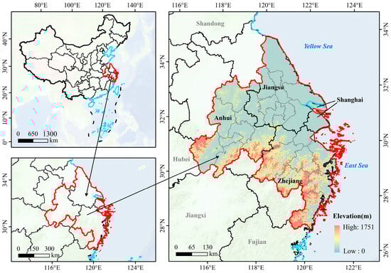 We selected the central region of the Yangtze River Delta in China as the research area for cross-regional tourism corridors, enabling a more intuitive multi-scalar analysis at the provincial and municipal levels to reflect the spatiotemporal evolution of corridors in rapidly urbanizing areas. The central Yangtze River Delta, located in East China (Figure 1), encompasses parts of Shanghai, Jiangsu Province, Zhejiang Province, and Anhui Province, with a total area of 358,000 km2 and a permanent population of 227 million. Geographically, the central Yangtze River Delta is adjacent to the Yangtze River and the East China Sea, characterized by a terrain that slopes from higher elevations in the southwest to lower elevations in the northeast, spanning latitudes 28°45′ to 33°25′ N and longitudes 118°20′ to 123°25′12″ E. This region centers around 27 cities, including Nanjing, Hangzhou, and Wuhu, driving high-quality development across the Yangtze River Delta. It is also home to numerous UNESCO World Heritage Sites, such as the Ming Xiaoling Mausoleum in Nanjing, the Humble Administrator’s Garden in Suzhou, and West Lake in Hangzhou.