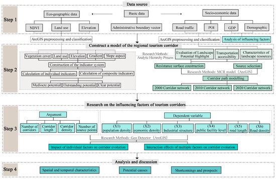 This study consists of four main steps. Firstly, data collection and preprocessing; secondly, simulation of the inter-regional tourism corridor network; then, investigation of the factors influencing the evolution of inter-regional tourism corridors; and finally, result analysis and discussion (Figure 2).