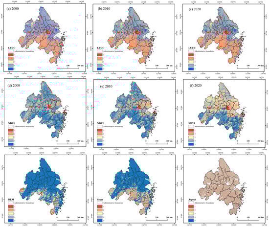 In terms of topographic characteristics, the elevation and slope classifications are lower in the northern and coastal areas of the research region, while the southern areas feature higher elevations and steeper slopes (Figure 3g–i). Both Anhui and Jiangsu Provinces exhibit relatively high elevation and slope classification levels, while Zhejiang, particularly southern Zhejiang, is predominantly composed of plains and, thus, has lower classification levels. Within Zhejiang, cities such as Wenzhou and Jinhua demonstrate lower elevation and slope classifications.