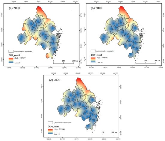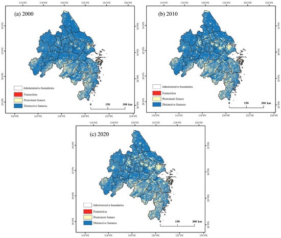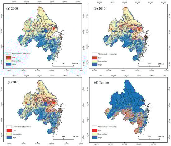 We utilize the natural breaks method to classify landscape evaluation results, obtaining three levels (high, medium, and low) of environmental resource characteristics and topographical conditions. In terms of environmental resource characteristics, a general trend of higher values in the north and lower values in the south is observed (Figure 4a–c). From 2000 to 2020, most areas in Anhui Province and nearly the entirety of Jiangsu Province exhibited relatively low values, with high-value areas accounting for approximately 21.31% of the total area. In contrast, Zhejiang Province showed generally higher values, with high-value areas covering about 44.3% of its total area. At the municipal scale, cities such as Hefei, Nanjing, and Hangzhou, along with most cities in Jiangsu Province, demonstrated relatively low values (high-value areas = 25.3 ± 0.55%).