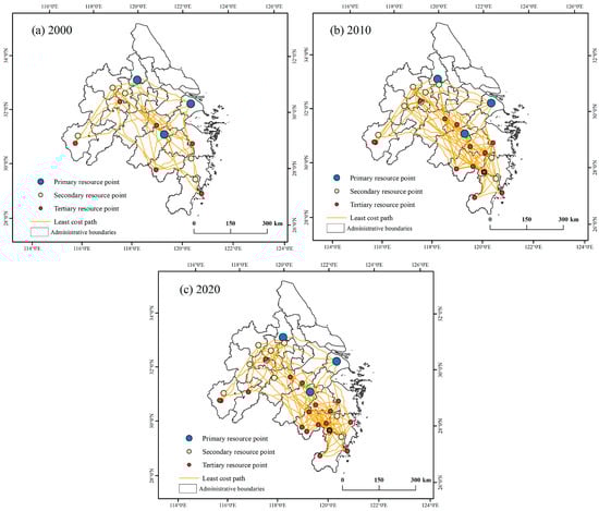 We employ the minimum cumulative resistance model to simulate the least-cost path network for the construction of inter-regional corridors in the central Yangtze River Delta region in 2000, 2010, and 2020 (Figure 7). At the inter-regional scale of the Yangtze River Delta, the number of corridors increased from 91 in 2000 to 435 in 2020, showing an increase of 378.02%. The total length of the corridors grew by more than tenfold, indicating a rising demand for inter-regional communication. The corridor density increased from 0.04% to 0.19%, with the fastest growth occurring between 2000 and 2010, followed by a gradual slowdown. The number of source points rose from 14 in 2000 to 25 in 2010 and further to 31 by 2020. This trend reflects the government’s high enthusiasm for discovering and developing tourism resource points, although overall, resources remain limited, leading to a slower construction pace in the subsequent decade (Table 5).