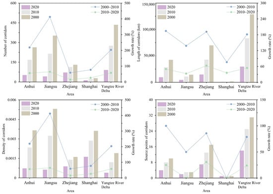 - Over the 20-year period, the number of corridors, corridor length, corridor density, and resource point quantity all increased to varying degrees across different regions of the YRD. These changes were influenced by factors such as geographic location and economic development. Among the regions, Zhejiang Province saw the largest increase in resource points, Hangzhou experienced the greatest growth in the number of corridors, and Ma’anshan had the highest increase in corridor density.