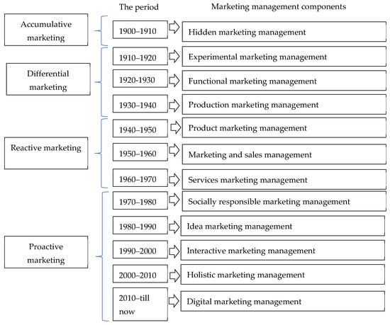 Figure 1 shows the interconnection and transformation of marketing management components in a historical context, reflecting the accumulation of knowledge and practical experience.
