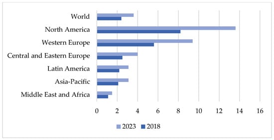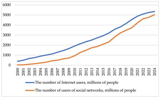 More than 66% of all people on Earth now use the Internet, and according to the latest data, the total number of users worldwide is 5.35 billion [24] (Figure 2). Over the past 12 months, the number of Internet users has grown by 1.8%, with 97 million new users since the beginning of 2023 [25].
