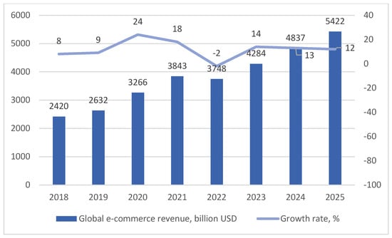 Global e-commerce revenue in billions of US dollars and growth rate *. * Source: own elaboration based on the data [25].