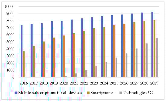 - Ericsson Mobility Visualizer. Available online: https://www.ericsson.com/en/reports-and-papers/mobility-report/mobility-visualizer?f=1&ft=2&r=2,3,4,5,6,7,8,9&t=1,2,3,4,5,6,7&s=4&u=1&y=2023,2029&c=3 (accessed on 29 September 2024).