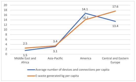 The relationship between the attributes—the average number of devices and connections and the growth of e-waste per capita—is described by a linear regression equation: