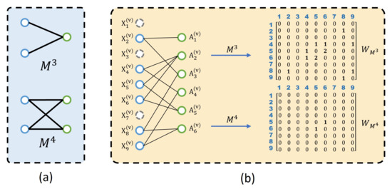 Motifs, which capture higher-order interactions in networks, are pivotal in understanding complex graph structures [21]. We extend the concept of motifs, traditionally applied to networks, to bipartite graphs. In our method, a motif is defined as a subgraph consisting of undirected links, as shown in Figure 1a. The third-order () and fourth-order () motifs are considered, and their corresponding motif adjacency matrices are constructed from the bipartite graphs generated earlier.