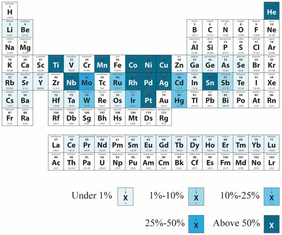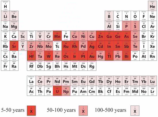 Recovery and reutilization of materials are regarded as key strategies for reducing greenhouse gas emissions in the built environment [,,]. Within those end-of-use scenarios, recycling is one of the widely used tactics, demonstrated by established infrastructure and developed supply chain networks in many geographic locations. While recycling is an increasingly common practice in the built environment, accurately defining recycling quality in order to compare technologies and material types remains challenging []. This is mainly due to the vast spectrum of scenarios that typically fall under the term ‘recycling’. Remanufacturing, downcycling, upcycling, and even reuse are all referred to as types of recycling, depending on the sector they occur in. The main challenge in assessing the material recovery quality of those solutions is that they exist on a continuum without clear boundaries []. Take, for example, end-of-use broken glazing being processed into translucent glass sheets. Would that process constitute an improvement in material quality (broken glass being turned back into a continuous sheet) and, therefore, be regarded as upcycling, or would it actually be considered a reduction in material quality (the glass loses some of its transparency in the process)? This ambiguity directly impacts the industry’s ability to determine the recycling potential of construction materials. In order to address this problem, the research community turned to an indicator that would allow simple and direct comparison between different material groups: market value [,]. The rationale behind the use of market value as an indicator is that fluctuations in value reflect the level of availability of technology and supply chains, as well as the industry’s demand for certain recycled materials over others. Even though the use of that indicator provides a clear measure of recycling feasibility, it fails to account for the wider environmental and societal implications of material recovery. Some recovered materials might have high market demand; however, their recycling process might be hazardous to human health or environmentally harmful to a degree that puts the justification of their recovery in question [,,,]. Similarly, some materials might have low market demand; however, due to their dwindling reserves in nature, it is critical to avoid using them in their primary (‘virgin’) form. To illustrate this point, Figure 1 and Figure 2 show the gap between reserve abundance and actual recycling rates in the industry.