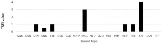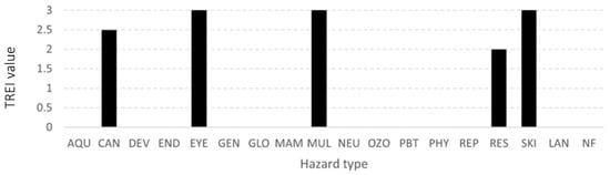 A weighting scheme is typically applied in order to prioritize elements of an assessment index based on their importance toward achieving a stated goal []. In environmental assessment frameworks, weighting approaches usually rely on proxy, midpoint, or endpoint methods. Proxy approaches tend to cluster variables that represent similar aspects, like using carbon dioxide to represent a group of greenhouse gases in the Global Warming Potential category in LCIA []. Mid-point approaches focus on weighting based on a given problem, like for example, acidification in LCIA []. Endpoint approaches focus on a higher aggregation level for weighting, like for example, the effect on human health or biodiversity in LCIA []. Given that TREI aims to avoid setting any predetermined prioritization of any specific hazard at this early stage, it has been decided to apply uniform weighting in this study. A future publication of the index will feature a comparative study experimenting with a range of weighting options to determine a beneficial solution.