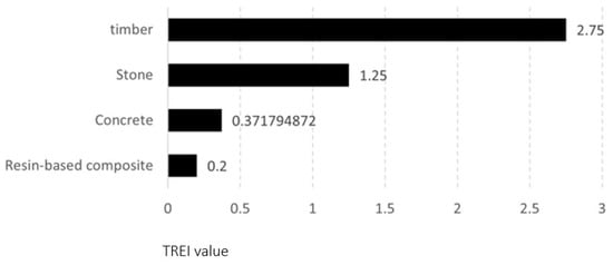 Two common products were compared in this material group: (1) STUDIO Collection, which is a resin-based surface product for interiors manufactured by Aristech Surfaces. This product is mostly based on primary-use materials. (2) Corian Solid Surface, which is a resin-based surface product using a mix of ground reclaimed minerals. The product is manufactured by DuPont Specialty Products USA and contains high post-consumer material content. As Figure 5 and Figure 6 show, the resin-based composite with the high recycled content is found to have preferable performance in all hazard type categories without exception. The highest recyclability–toxicity index numbers are recorded for the respiratory sensitization hazard category (RES) and the eye irritation/corrosivity (EYE) hazard category.